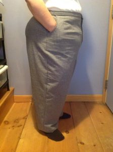 For the gory details, my measurements are 45″ waist, 55″ high and low high hip, 5’4″ tall, with short inseam, and a very challenging crotch curve. I am intermediate sewist, and this was my very first fly front. I am planning on making my next pair in blue gray twill, and my third pair in a lovely black linen. The thought of comfortable pants in cool and attractive material has me over the moon.